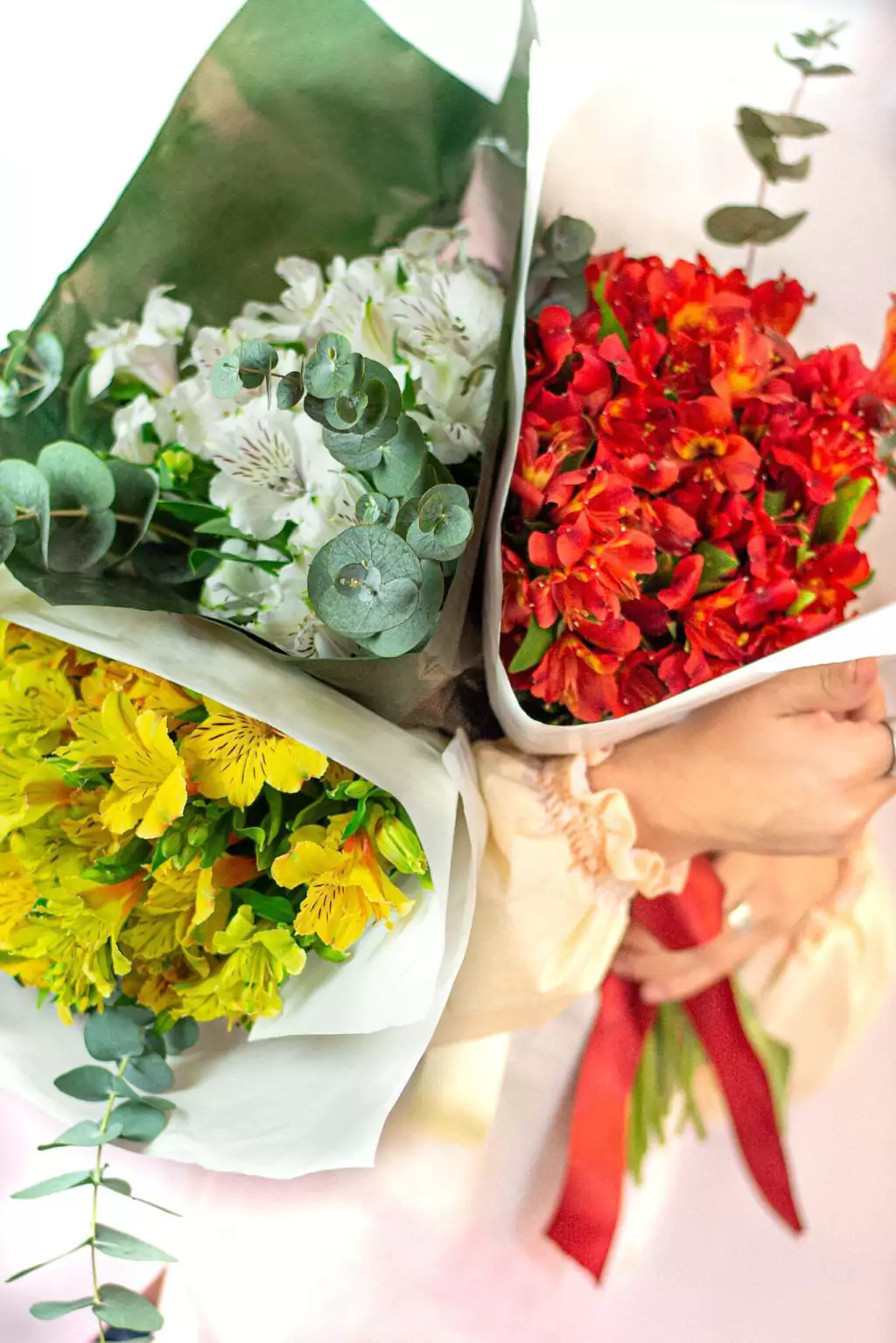 Uma chuva de astromélias! Lindo buquê de astromélias embalado em papel seda e acabamento em fita de cetim.