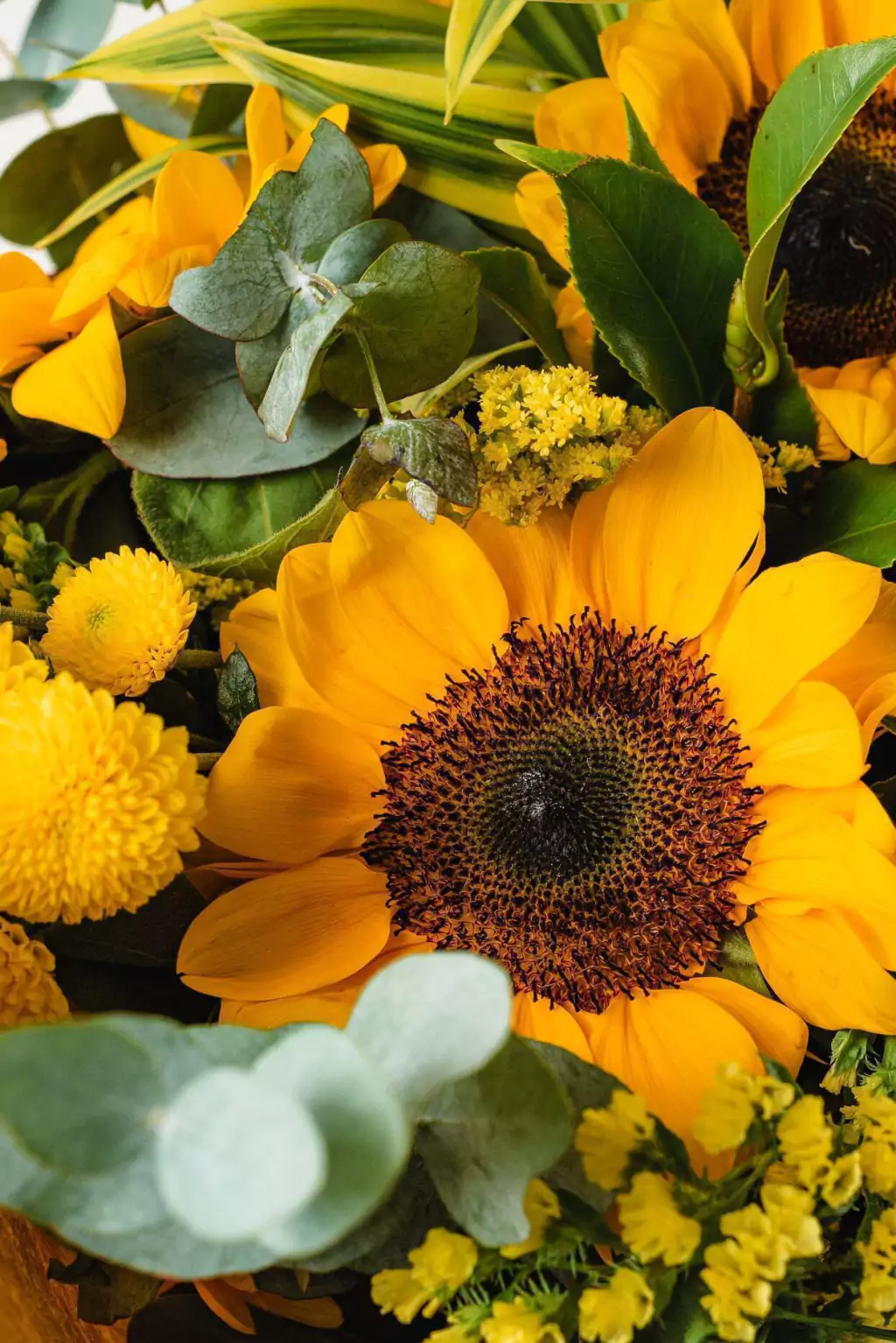 Sorriso em forma de buquê. O Buquê CÉLIA MARIA é uma composição divertida e iluminada. O buquê de girassóis ideal para presentear com alegria. Aproximadamente 40 cm de altura e 30 cm de largura.