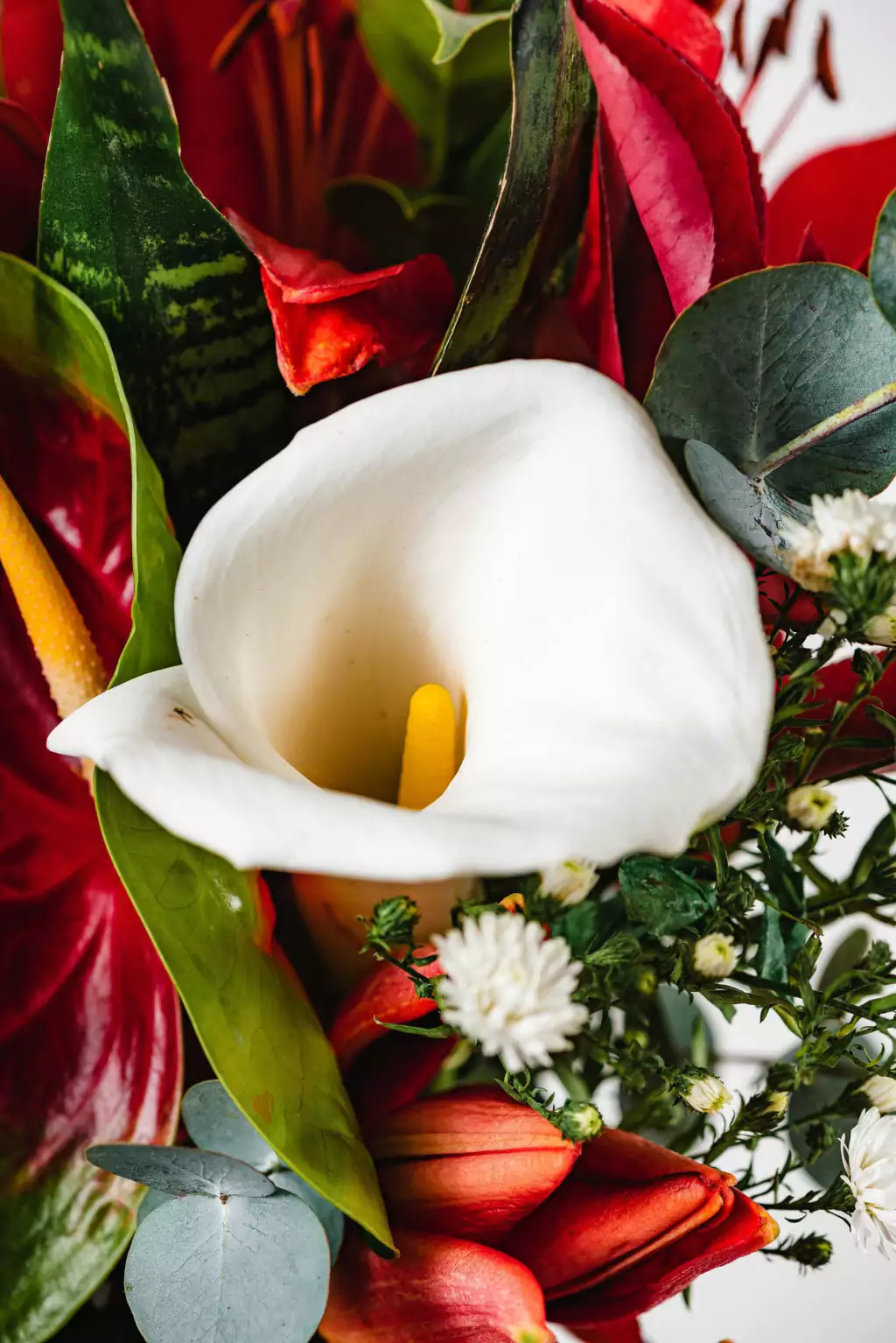 Moderno e sofisticado. Com antúrios e Copos de Leite, esse buquê cria uma composição exclusiva e elegante. A escolha perfeita para quem ama flores e folhagens com um toque mais selvagem.