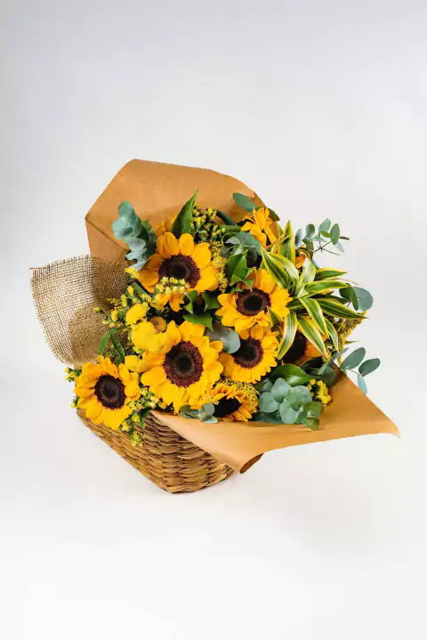 Uma cesta com girassóis radiantes e estátice amarela, finalizada com juta e kraft. O presente perfeito para iluminar momentos especiais!